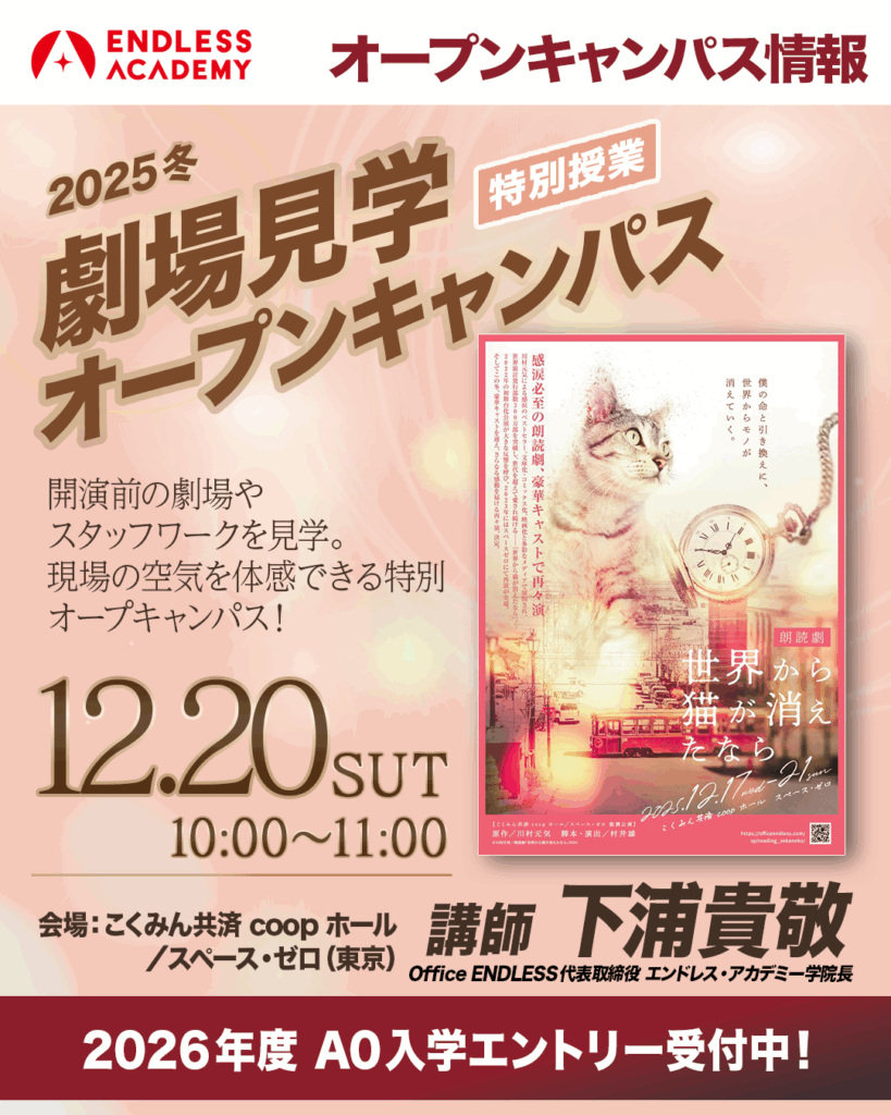 【12/20(土)開催決定】朗読劇「世界から猫が消えたなら」劇場見学オープンキャンパス!